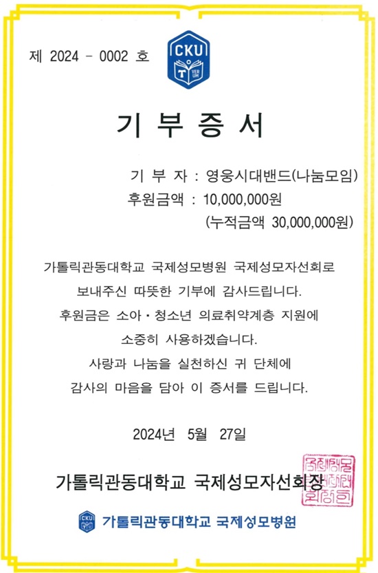 영웅시대밴드 나눔모임, 국제성모병원에 1천만원 기부