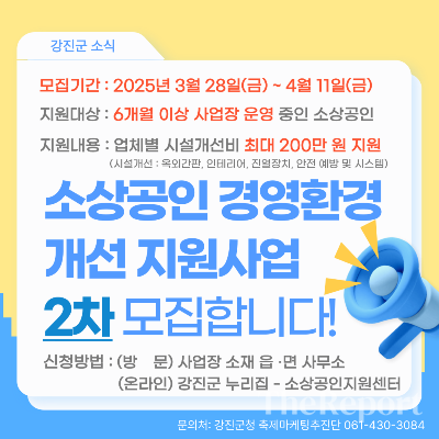 강진군, 소상공인 경영환경 개선 지원사업 2차 모집