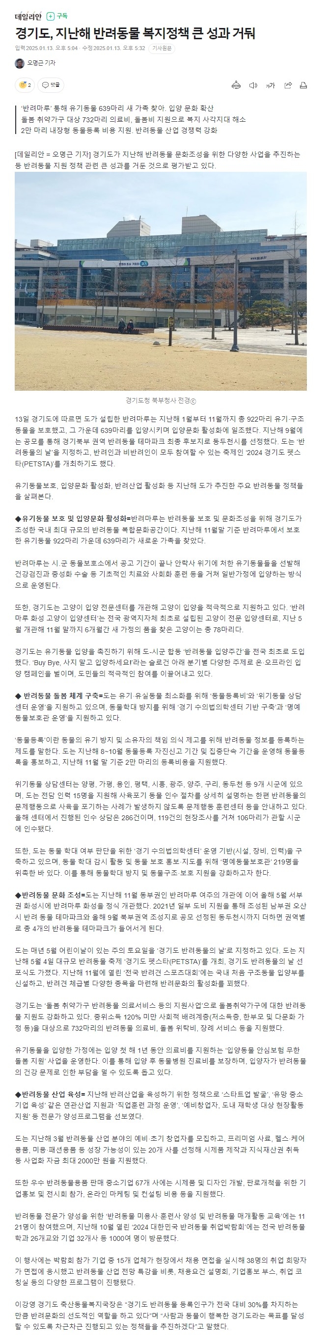경기도, 지난해 반려동물 복지정책 큰 성과 거둬
